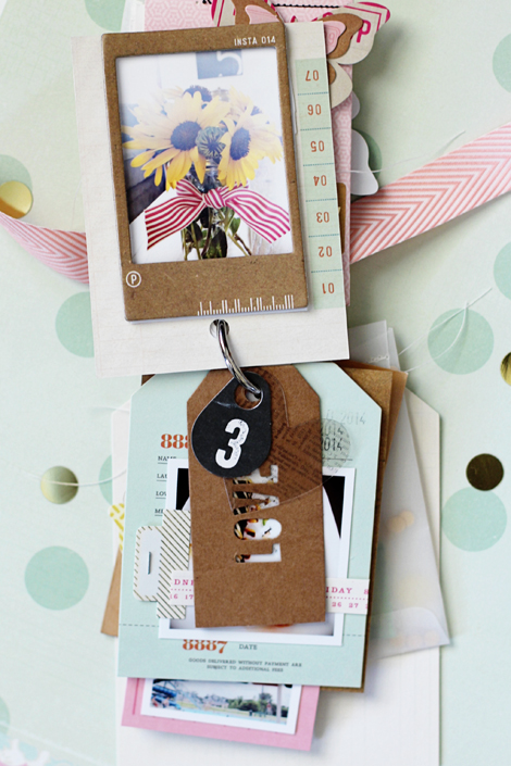 To start the album, I chose lots of mixed tags from the Notes & Things collection. I also used several journaling cards from the same collection to mix up the page sizes–lending a more layered look.